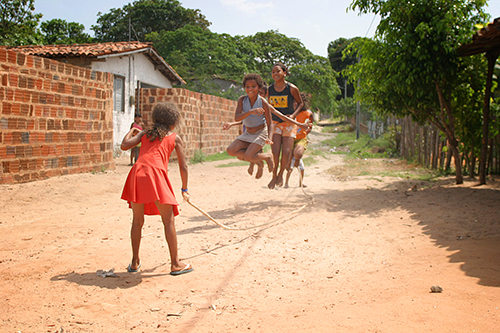 Como brincar: arrumar a metade das cordas de um lado e as outras do outro para ficarem paralelas, formando um caminho. Começar com uma distância de meio metro entre elas. Convidar as crianças a andarem pelo caminho para chegar na praia, no rio, no lago, de acordo com o que têm próximo do lugar onde vivem. Combinar que, quando chegarem na água, podem nadar se quiserem. A cada vez que todas as crianças passam pelo caminho, vai sendo diminuída a largura até ficar tão estreita que só dê para andar colocando um pé na frente do outro. Quem não conseguir, fica ao lado olhando os outros tentarem. A brincadeira termina quando o caminho ficar bem estreito, que não caibam mais os pés das crianças.